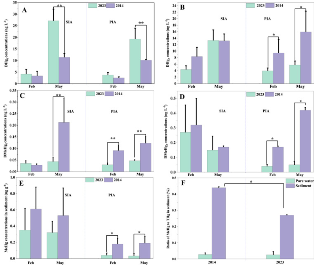 SPD事件提高了沉积物-水界面的DHg浓度,其中,2月份SIA和PIA分别增长了24.02%和47.67%,而5月份分别增长了138.18%和89.92%(图4A)。5月份,界面水中DHg浓度显著增加,与雨季相吻合。2023年2月和5月,PIA-DMeHg显著下降,分别下降79.45%和61.52%,这表明DMeHg不遵循DHg的模式(图4C)。SPD后SedPIA和SedSIA的MeHg浓度分别显著下降了78.95%和47.17%(图4E)。而2014年沉积物颗粒中MeHg含量为0.44±0.01%,显著高于2023年(0.27±0.00%),这表明近年来地表沉积物MeHg的累积有所减少。