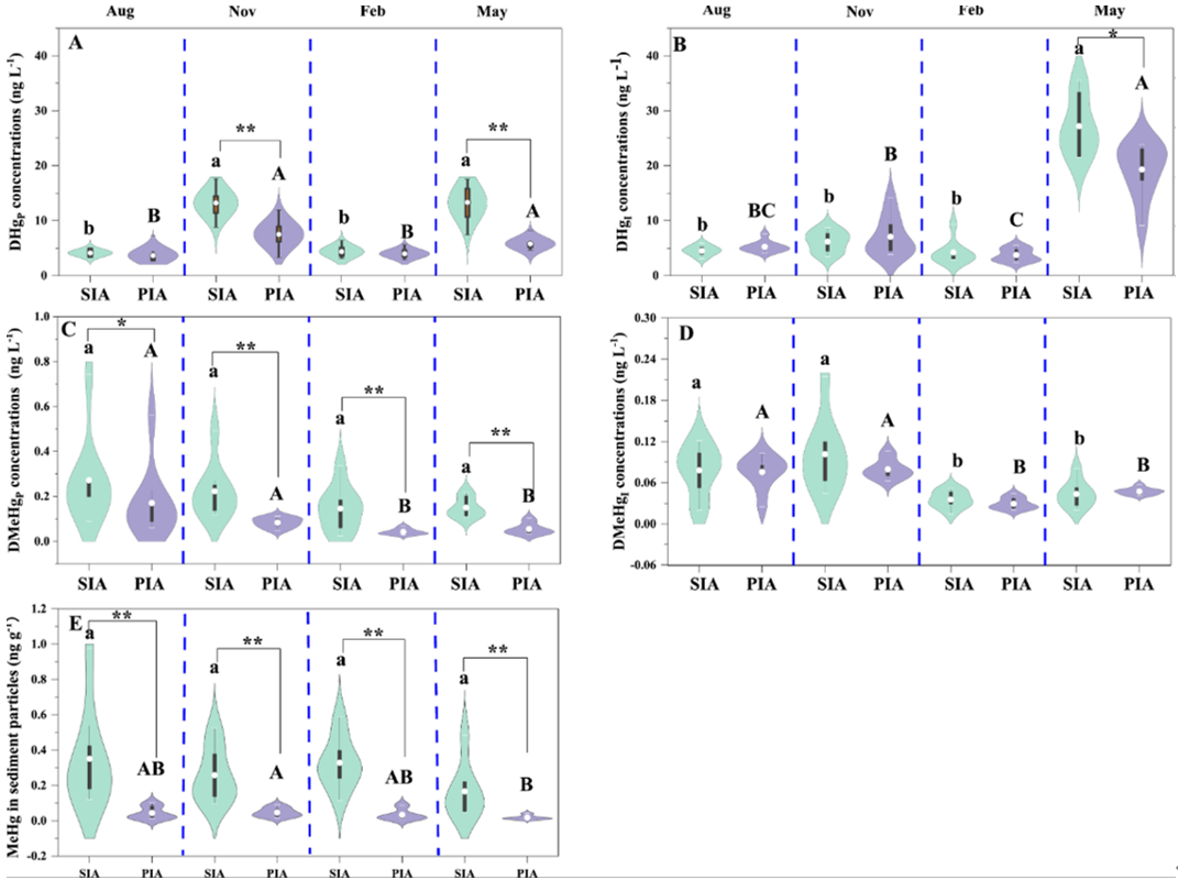 在5月(雨季),界面水DHg浓度明显高于8月(界面水和间隙水DOM)。相反,8月份孔隙水DMeHg浓度显著高于其他月份的浓度,5月份最低,这分别于藻类生长与降雨径流增强时期相匹配。此外,SIA沉积物固相MeHg高于PIA,这表明SedPIA对甲基汞的保留能力更高。