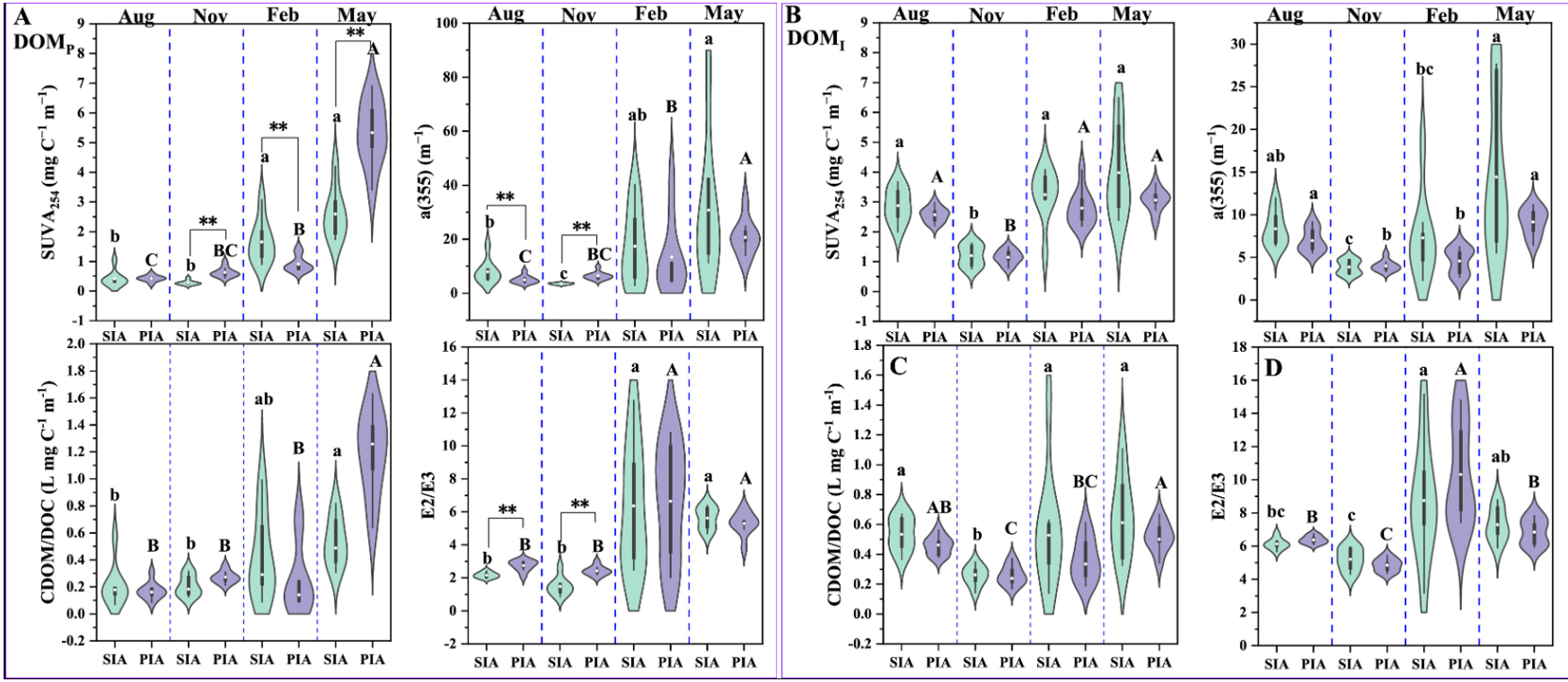 SIA-DOMP中的类腐殖组分低于PIA-DOMP(图2),这表明PIA-DOM较大比例的成分来源于浮游生物演化和陆地输入。相反,SIA-DOMP中藻源性蛋白质组分的荧光强度高于PIA-DOMP。此外,8月份沉积物界面水和孔隙水DOM具有显著高于其他时期的藻源性类蛋白质组分,这意味着积累了更多来自于藻类分解的类蛋白组分。
