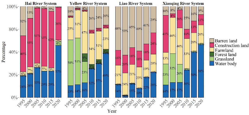 图5 1995-2020年间海河、黄河、辽河及小清河流系入海河口土地利用类型的比例动态变化