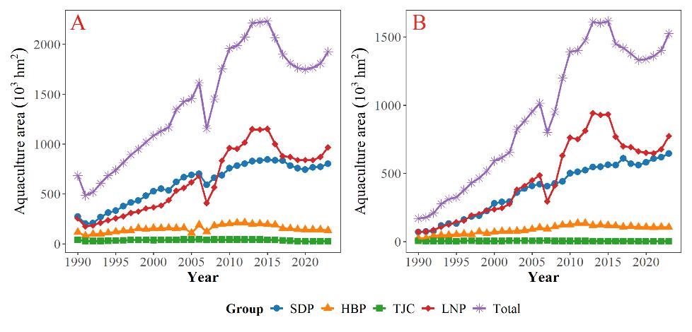 图8 环渤海地区三省一市水产养殖面积(A)和海水养殖面积(B)(数据来源:《中国渔业统计年鉴》)