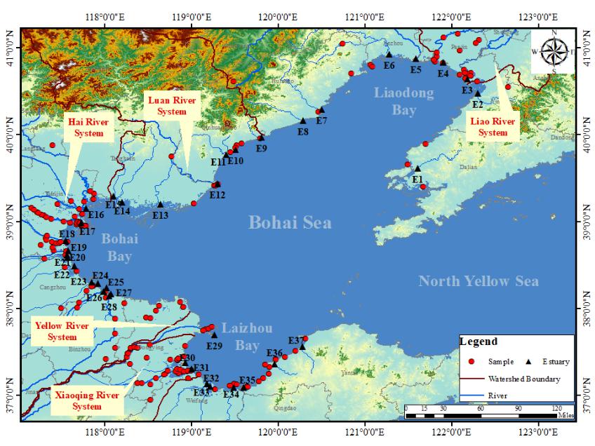 图1 环渤海主要入海河流河口及数据搜集的样点概况