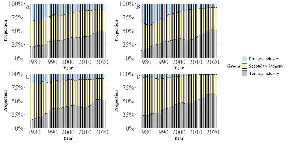 图7 环渤海地区河北省(A)、山东省(B)、辽宁省(C)和天津市(D)产业结构年度变化。(数据来源:各省市统计局)