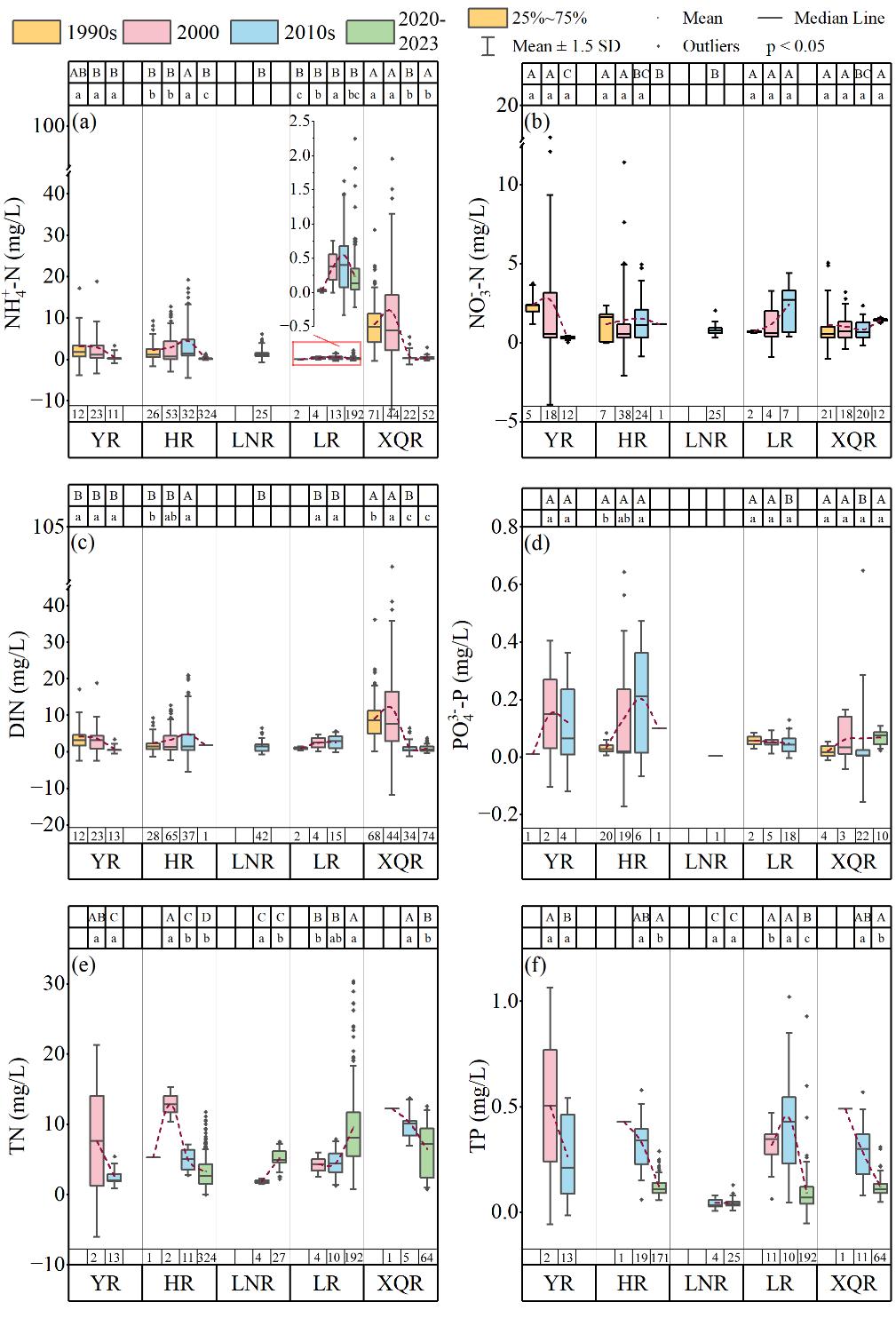 图3 1990s至2023年NH4+-N (a)、NO3–-N (b)、DIN (c)、PO43−-P (d)、TN (e) 和 TP (f) 的浓度变化