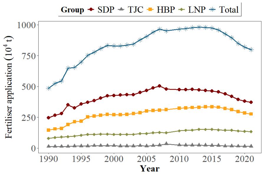 图9 1990年至2021年环渤海地区三省一市化肥施用量及施用总量的变化(2009年数据缺失,数据来源:《中国农村统计年鉴》)