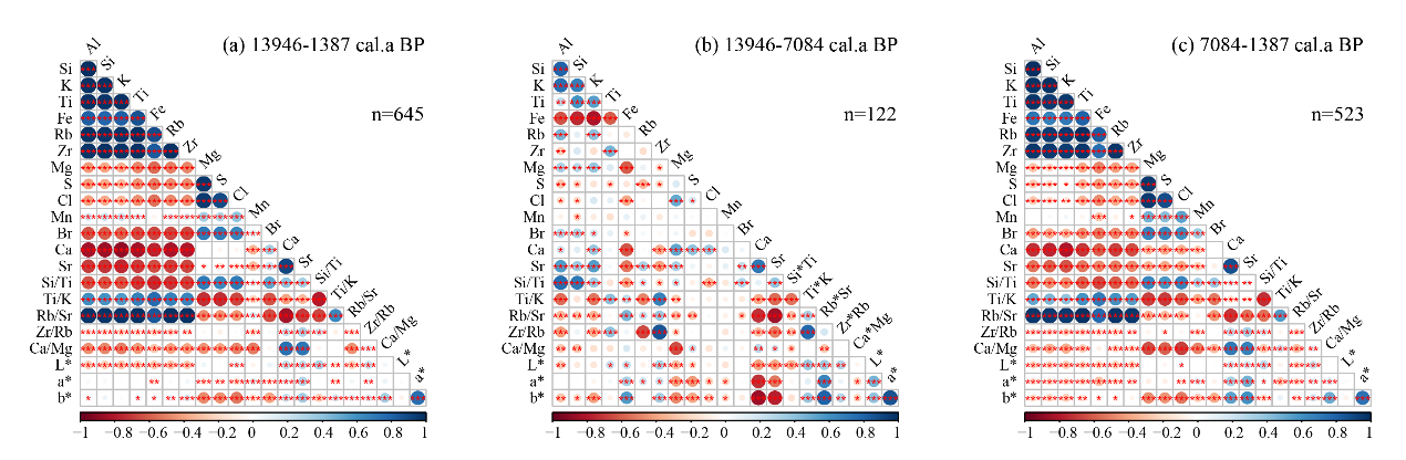 图1 XY1801岩心中地球化学数据与色度数据的皮尔逊相关矩阵(Pearson correlation matrix)。蓝色圆圈表示正相关,红色圆圈表示负相关。圆圈的大小和颜色强度与相关系数成正比。显著性水平:*** p < 0.001,** p < 0.01,* p < 0.05。