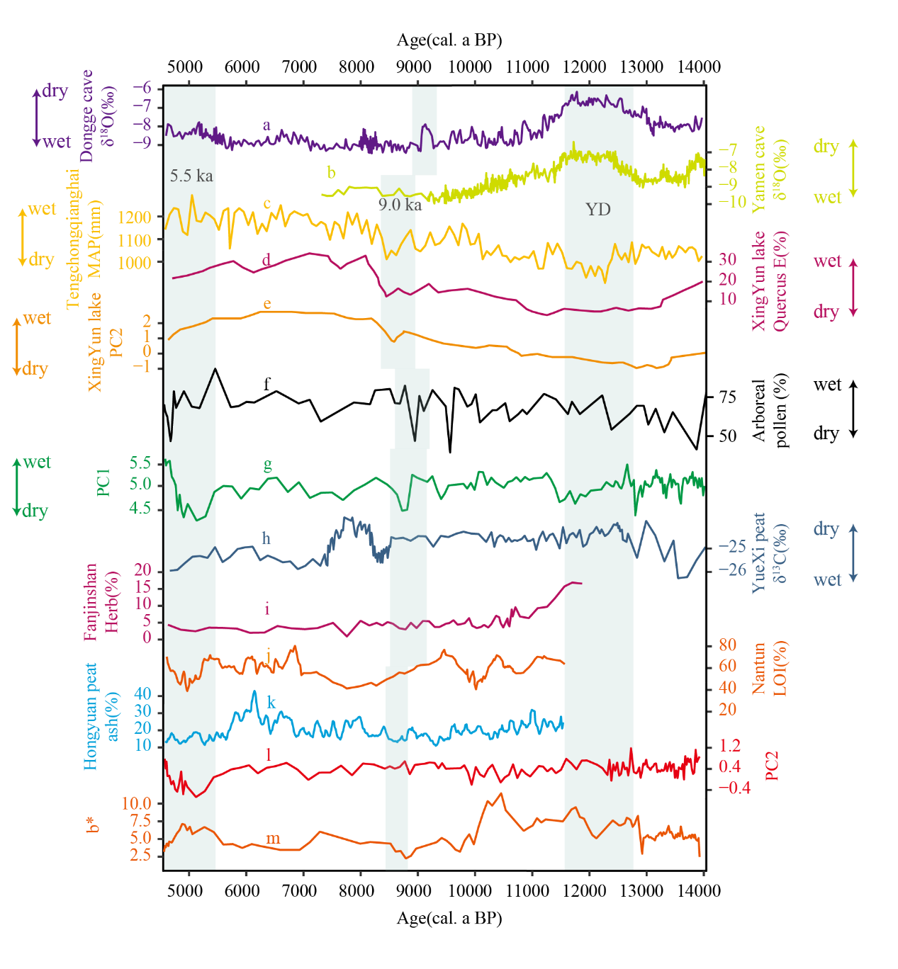 图2 不同地区的古气候记录的比较。(a)董哥洞石笋 δ18O 。(b)Yaman洞石笋的δ18O 。(c)腾冲青海湖的 MAP 值。(d)兴云湖的常绿栎类花粉百分比和(e)基于花粉的 PC2 分数。(f)树木花粉百分比(本研究)。(g)地球化学元素的 PC1 分数(本研究)。(h)玉溪泥炭的 δ13C 值。(i)梵净山的草本花粉百分比。(j)南屯泥炭的灰分含量。(k)红原泥炭的灰分含量。(l)地球化学元素的 PC2 分数(本研究)。(m)色度 b* 值(本研究)。浅蓝色区域突出显示了外源输入显著减少的时期。