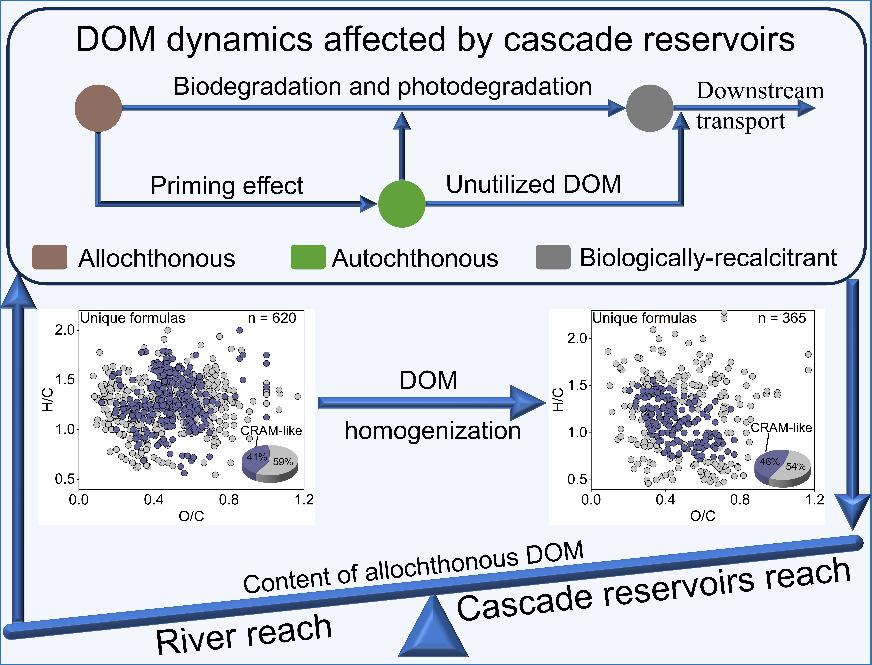 近日,贵州大学大学王万发、奥尔登堡大学Philipp Maurischat和香港科技大学何丁、易沅壁老师等合作在Water Research上发表了题为“Cascade dams amplify molecular transformation and compositional homogenization of dissolved organic matter on the Eastern Tibetan Plateau”的研究论文(DOI: 10.1016/j.watres.2026.125765). 全球河流筑坝破坏了水文连通性,使水库成为全球碳循环的关键调节者,但梯级水库中溶解有机质(DOM)的分子特征及具体转化过程仍不明确。本研究以青藏高原东部澜沧江梯级河流-水库系统为研究对象,整合水化学、稳定碳同位素和傅里叶变换离子回旋共振质谱(FT-ICR MS)技术,解析了DOM的分子归趋。研究通过贝叶斯稳定同位素混合模型发现,梯级筑坝促进了内源DOM的生成,使浮游植物源DOM占比从河流段的27±10%提升至梯级水库段的31±12%(后验均值±标准差);同时,水库静水区的热力条件通过增强光化学和微生物分解过程,加速了陆源DOM的周转,并通过消耗易降解组分降低了Jaccard相异系数,加剧了DOM组成的均一化。此外,筑坝导致的水文破碎化促进了内源DOM的向下游输送,估算得出全球河流向海洋输出的内源溶解有机碳通量达141±2 Tg C/年。本研究揭示了全球水库的快速扩张从根本上改变了DOM的生物地球化学归趋,对区域和全球碳循环具有重要影响。