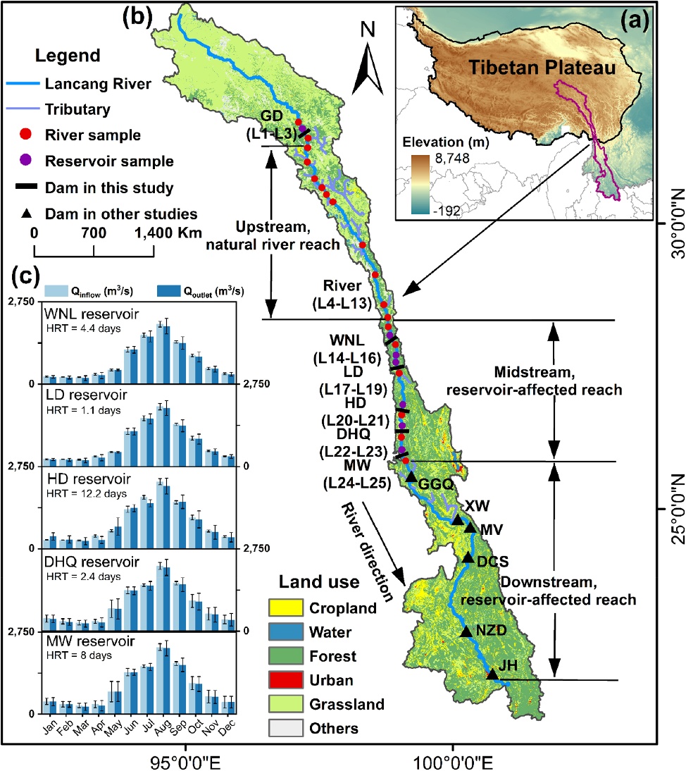 Fig. 1. (a) Location of the Lancang River on the Tibet Plateau. (b) Sampling locations in the Lancang River, including the Guoduo (GD), Wunonglong (WNL), Lidi (LD), Huangdeng (HD), Dahuaqiao (DHQ), and Miaowei (MW) reservoirs. (c) Hydraulic retention time (HRT) of reservoirs with corresponding monthly average discharge at inflow and outflow points. Detailed information of the reservoirs is provided in the Supplementary Material Table S1.