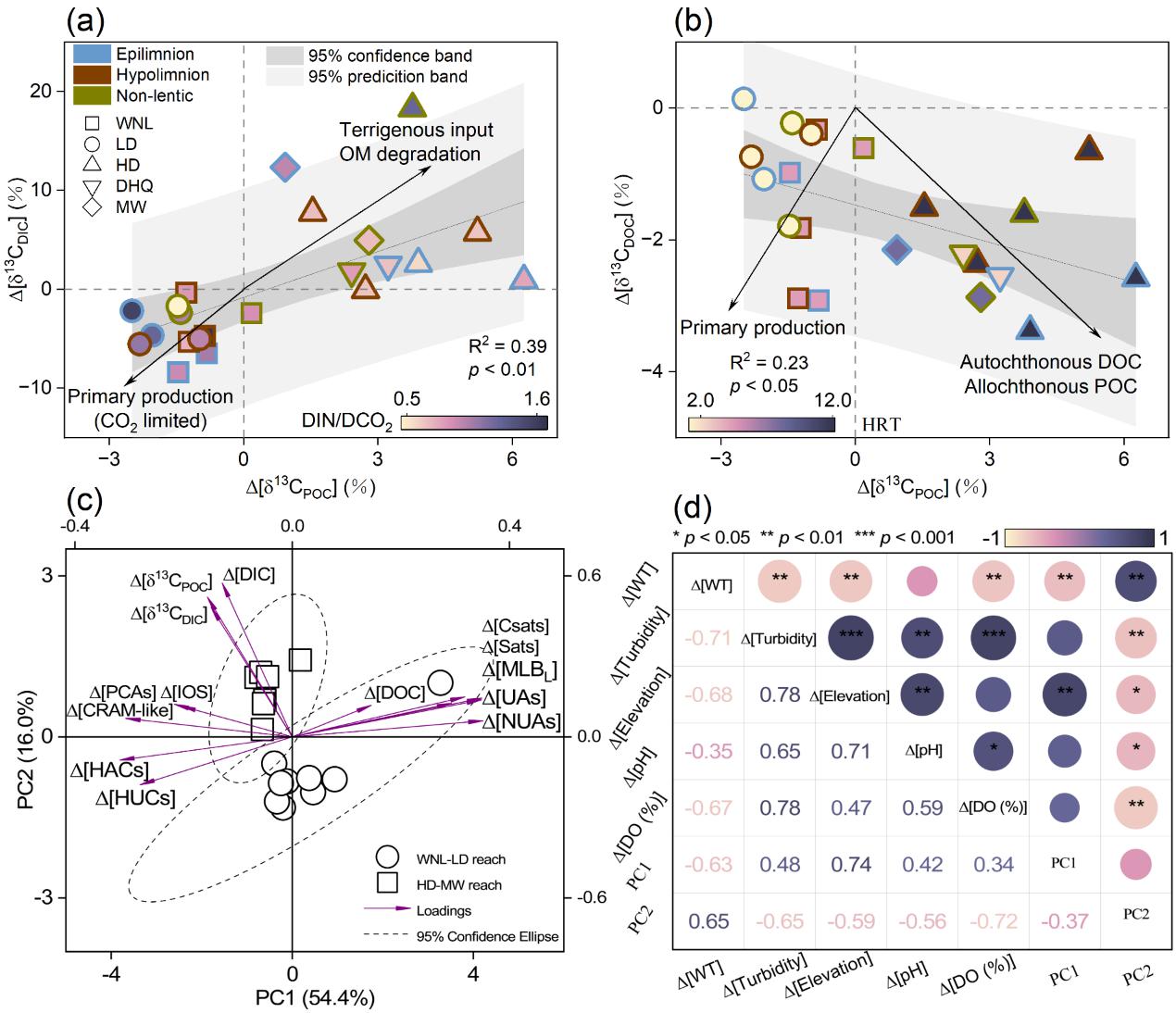 Fig. 4. The mechanism of organic matter transport and transformation. (a-b) The relationship between D[d13CDIC], D[d13CPOC], and D[d13CDOC] across plateau cascade reservoirs is depicted, with the four quadrants representing different processes involving these parameters. DIN:DCO2 molar ratio > 0.12 indicates CO2 limitation, while < 0.12 suggests nitrogen limitation (Luo et al., 2022; Wang et al., 2024). (c) Results of PCA based on molecular parameters and carbon-related parameters. (d) Matrices of spearman’s correlations for physicochemical variables (*p < 0.05; **p < 0.01; ***p < 0.001). Purple and pink dots within squares indicate positive and negative correlations, respectively.