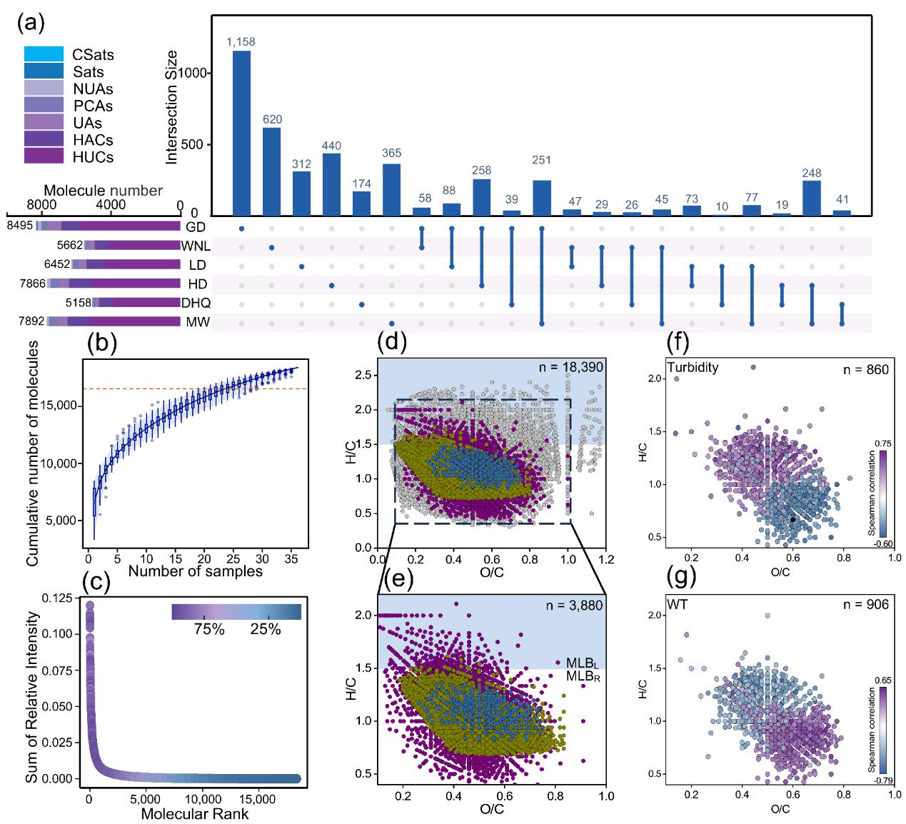 Fig. 3. FT-ICR MS molecular characterization of dissolved organic matter (DOM) from the Lancang River. (a) Spatial distribution of molecular formulae across plateau cascade reservoirs. (b) Number of unique molecular formulae with each added sample. Confidence intervals are calculated over 1000 permutations. The red dashed line indicates 90% of molecular formulae. (c) Rank abundance of the compounds across all samples shows that the compounds with the highest total relative intensity are most ubiquitous. Molecular compounds are colour coded by the percentage of samples in which they occurred. The van Krevelen diagrams of (d) all 18,390 molecular formulas in all 36 samples (all dots, with gray dots representing noncore DOM compounds) and (e) core 3,880 DOM compounds are depicted: yellow indicates 2,383 matching the CRAM criteria (potentially containing lignin and its derivatives), and blue dots represent 345 IOS formulae. The van Krevelen diagrams of the 3,880 core DOM compounds, with panels (f) and (g) displaying those significantly correlated (p < 0.05) with turbidity (860 compounds) and WT (906 compounds), respectively. Purple circles represent positive correlations, while blue circles represent negative correlations of the core compounds.