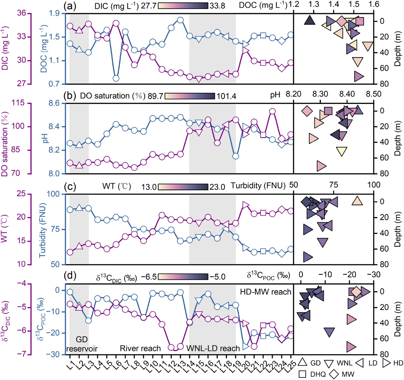 Fig. 2. Variation in geochemical parameters along the Lancang River, including dissolved inorganic carbon (DIC), dissolved organic carbon (DOC), dissolved oxygen (DO) saturation, pH, water temperature (WT), turbidity, and stable carbon isotopes (i.e., d13CDIC and d13CDOC).