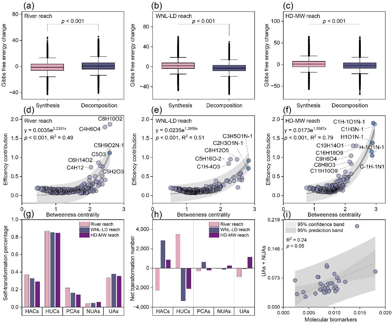 Fig. 5. Molecular transformation of DOM from the Lancang River. (a-c) Gibbs free energy change (DG) of synthesis and decomposition transformations. (d-f) Key molecular transformations can be identified through betweenness centrality and efficiency contribution parameters in molecular network analysis, with blue representing nitrogen-containing DOM molecular transformations. In the image, the molecular transformations are abbreviated for simplicity (e.g., H2 = +2H). (g) Self-transformations are defined as reactions in which the product and precursor belong to the same compound. (h) A net transformation number > 0 for molecular compounds is defined as “net-increase”, while a value < 0 is designated “net-decrease”. (i) Correlation between (UAs + NUAs) and molecular biomarkers, where the molecular biomarkers are listed in the Supplementary Material Table S10 (Yao et al., 2024).